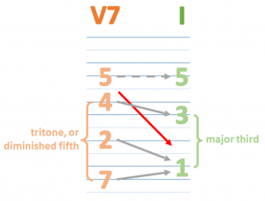 V7 is 5+7+2+4, and the instability of 4 creates a demand for 3. But V7 also contains the very unstable interval of the tritone (or diminished fifth), which appears in the V7 in the interval from scale degree 7 up to 4. The tritone interval is so discordant that it was referred to centuries ago as "the Devil in music"! During the V7-I move, this discordant tritone between 7 and 4 collapses inward a semitone at both ends, and the result is the stable and restful concord of a major third from 1 up to 3. All of these effects account for the voice-leading that can be seen as the notes of V or V7 are replaced by the notes of I during a V7-I or V-I resolution.