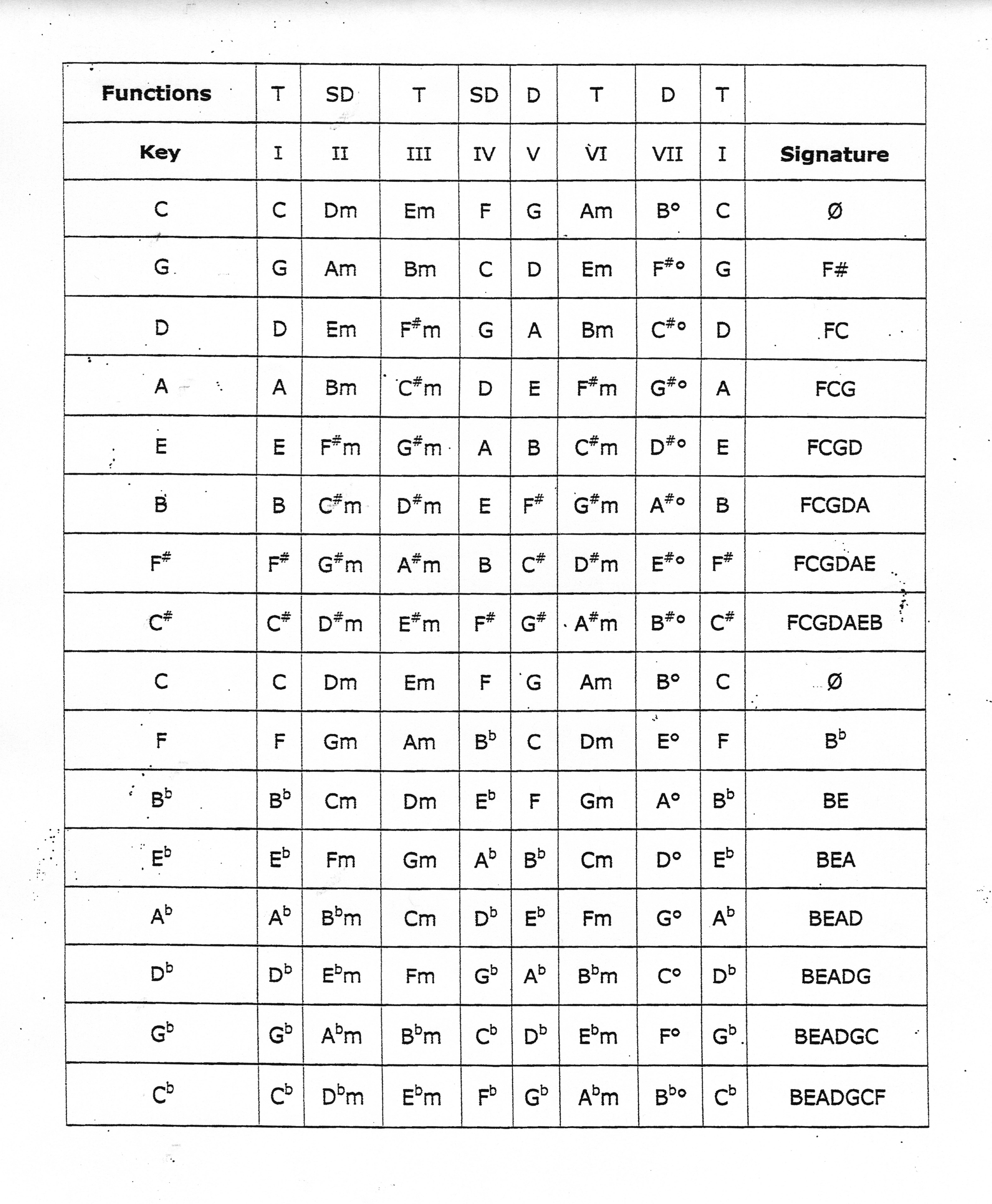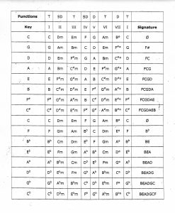 One of the first determinations, when looking for the greatest number of chord options for our song, is to establish what key that song is in. Determining key is easier with the help of the following chart which lists the names of the keys in the left column, lists the number of sharps and flats in the right column, and displays the chords indigenous to that key in the rows between. When attempting to establish which key a particular song is in, there are lots of criteria that music theorists factor into the equation, but in most cases we can simply state that “majority rules”. In other words, whatever key most of the chords are in, is a pretty good key to work within.